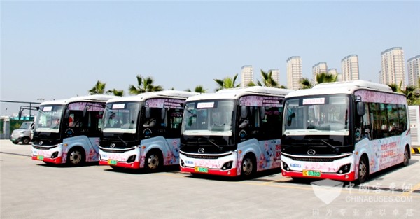 金龙“樱花接驳车”以粉白樱花为主色调,配以海经蓝,错落有致的樱花点缀在车身,好似繁星点点,宛若“樱”约而来。