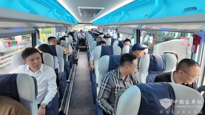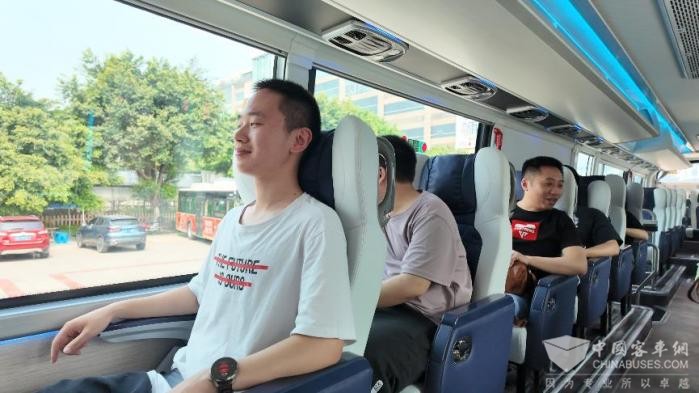 新V系客车究竟怎么样?在实车体验环节,与会嘉宾代表们先后查看了车辆内部设计和制造工艺,并亲身感受了新V系高铁遮阳帘、车内氛围灯、智能座舱带来的驾乘体验升级,给出了自己的真实评价。来自重庆龙华客运公司的负责人陈明建在参观了新V系客车后主动承担起“司机”一职,开车载着二十余位嘉宾代表们驶出会场,沿着重庆美丽的北滨路缓缓行驶、欣赏一路繁华景色。既是龙华的经营车主,又是资深大巴车驾驶员的陈明建熟练地操控着方向盘并表示,“可以,开着很舒适。”