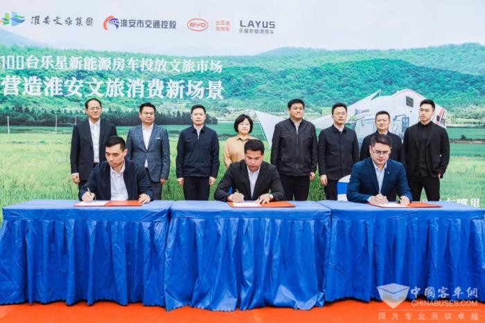 2024年4月20日,比亚迪与江苏安迪(经销商)、威莱德(房车企)在江苏省淮安市正式签署房车底盘战略合作协议。各方将通力合作,推广500台比亚迪混动房车专用底盘,共推底盘及整车业务发展,提升新能源房车市场竞争力。