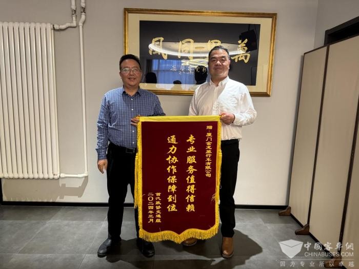 首汽旅游车公司党委书记、经理金龙向金旅国内销售公司常务副总经理李红斌颁发锦旗