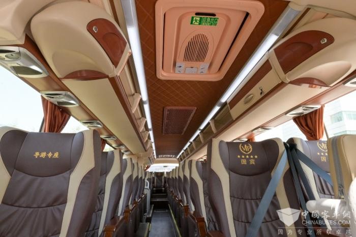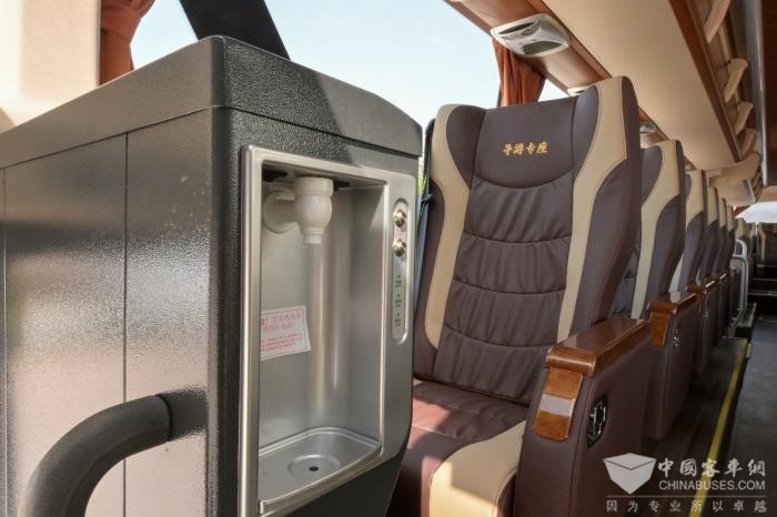 为打造国宾级服务,提升长途旅行体验,苏州金龙这批车辆采用2+1座椅布局,配备饮水机、两台22寸电视、超大行李舱和无线麦克风等娱乐设施,同时每个座椅均设USB充电插口,既充分满足游客旅行中的各种休闲需求,又兼顾手机充电等细节,为游客营造了温馨舒适的“移动之家”。