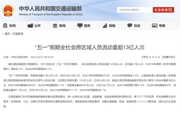 在社交平台上,“每个城市都来了1亿人”“游客攻占多个旅游城市”等话题持续霸榜。全国道路客流量快速攀升,多地开启“高峰迎客”模式。据交通运输部数据显示,全国公路跨区域人员流动量124977万人次,日均24995.4万人次,比2023年同期增长2.1%。其中,公路营业性客运量17385万人次,日均3477万人次,比2023年同期增长6.5%。