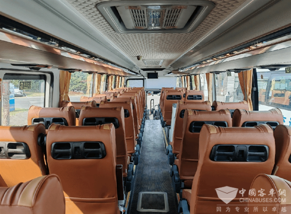 这批客车车内选用更舒适的深咖色和奶白色内饰搭配,使用菱形软装和圆角设计,让每位乘客在旅途中体验贴心、舒适。更符合人机工程学设计的商务座椅,让旅客安心休息。USB接口、高铁式行李架……尽显贴心。