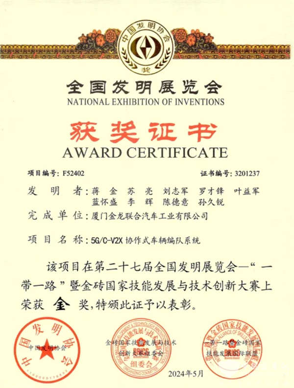 在现场评审环节,我司参展职工充分发挥个性和潜质,生动活泼地介绍自己作品的结构、性能、原理及创新亮点,阐述自己的发明思路,在展会上吸引了众多参展商、观众的驻足,也受到专家评审的高度重视,赢得了现场评委和嘉宾的赞许,成为此次展会上一道靓丽的风景线。其中“燃料电池客车碰撞安全检测装置及控制方法”“5G/C-V2X协作式车辆编队系统”“智能车载终端”获得金奖,“ MTV整车电池一体化”“客车无钥匙启动系统的开发与应用”获得银奖,“一混合动力汽车动力电池全生命周期控制系统”获得铜奖。据悉,这6个项目均已申请成果专利,其中多数技术成果已批量应用于金龙客车上,切实推动发明成果落地生根,开花结果。