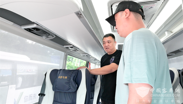 在试乘环节,南京某企业负责人林总先后登上四台新V系客车体验,分享了他的感受:“2023年我就去过苏州金龙,参观了整个客车生产线。通过这次南京站推介会产品介绍以及几台车试乘下来,我的感触很深。新V系总结了近几年来的客户需求,采用了机器人焊接、喷漆,不仅提高了生产效率,还在细节上面做到了精益求精,座椅乘坐感觉很舒适。此外新V系还装备了很多智能系统,感觉苏州金龙是真用心了!”