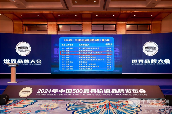 2024年6月19日,由世界品牌实验室主办的第二十一届世界品牌大会暨2024年中国500最具价值品牌发布会在北京举行,会上公布了2024年(第二十一届)《中国500最具价值品牌》分析报告,厦门金龙联合汽车工业有限公司(简称“金龙”)以967.82亿元的品牌价值荣登榜单第113位,金龙品牌价值较上一年增幅达19.51%。据了解,金龙品牌价值连续十一年保持超过10%的增长率,展现了中国汽车制造领军企业的强劲发展潜力。