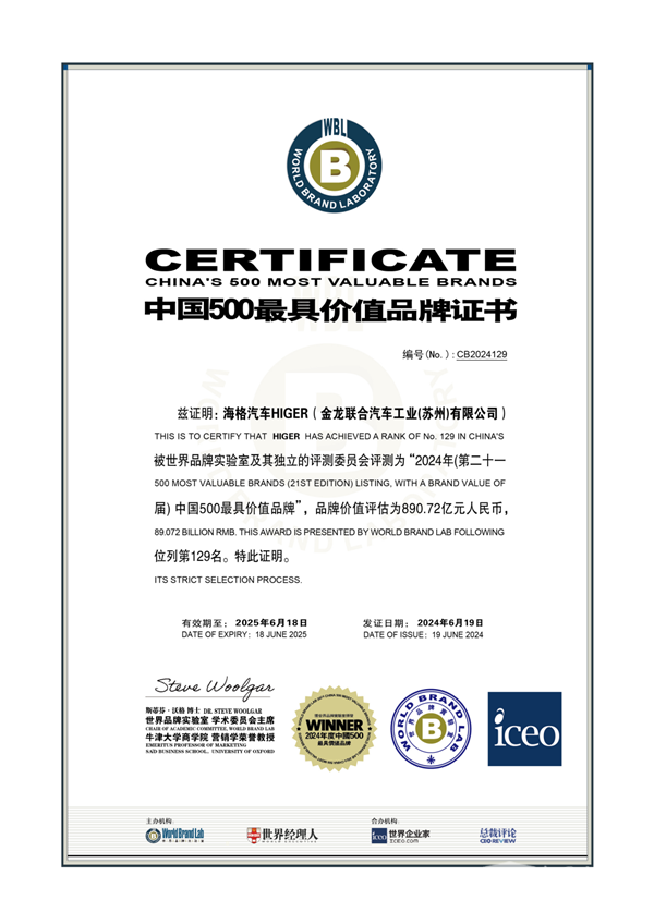 2024年6月19日,由世界品牌实验室(World Brand Lab)主办的第21届世界品牌大会在北京举行,会上隆重发布了2024年中国500最具价值品牌。金龙联合汽车工业(苏州)有限公司(简称“苏州金龙”)再次上榜,以890.72亿元的品牌价值位列第129位。