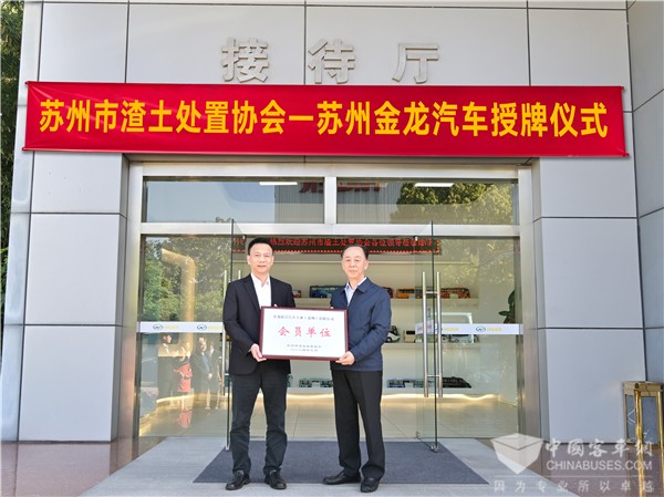 苏州市渣土处置协会会长金建民(右)向苏州金龙党委书记、董事长陈笃廉授牌