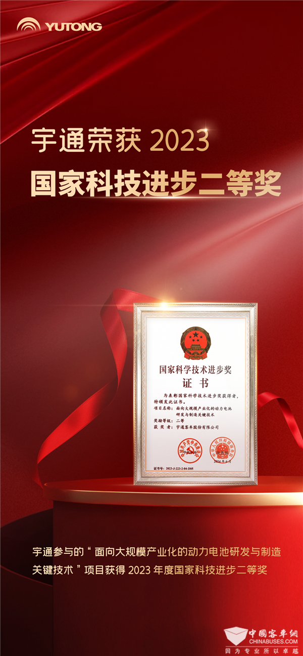 2024年6月24日上午,全国科技大会、国家科学技术奖励大会、两院院士大会在北京人民大会堂隆重召开。2023年度国家最高科学技术奖、自然科学奖、技术发明奖、科技进步奖和国际科学技术合作奖评选结果揭晓。宇通参与的“面向大规模产业化的动力电池研发与制造关键技术”项目荣获2023年度国家科学技术进步奖二等奖。这是宇通在新能源客车领域获得的又一项重要荣誉,体现了国家对宇通在新能源领域核心竞争力及技术创新实力的肯定。