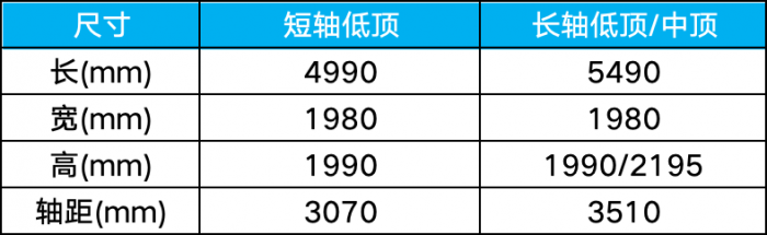 新车提供低顶、中顶、高顶以及短轴、长轴等多种车型版本,具体尺寸如上。这个尺寸可以说是卡着C类驾照可驾驶的极限,尽可能提升了尺寸和空间利用率,车宽接近2m的同时,车高最高控制在了2.2m以内,避免了部分路段或地下停车场的限高场景。