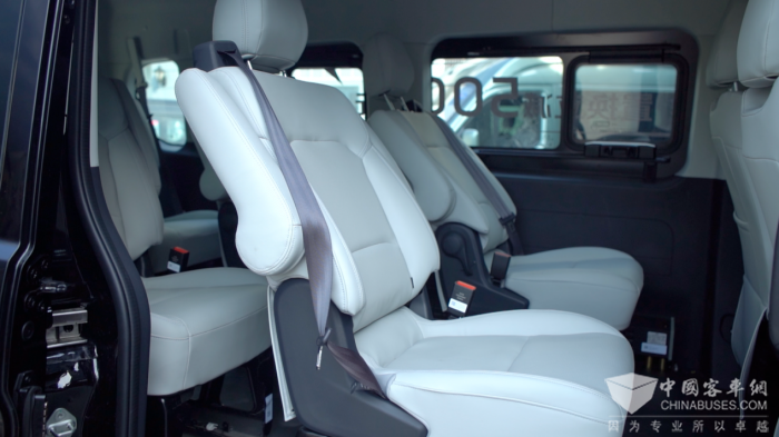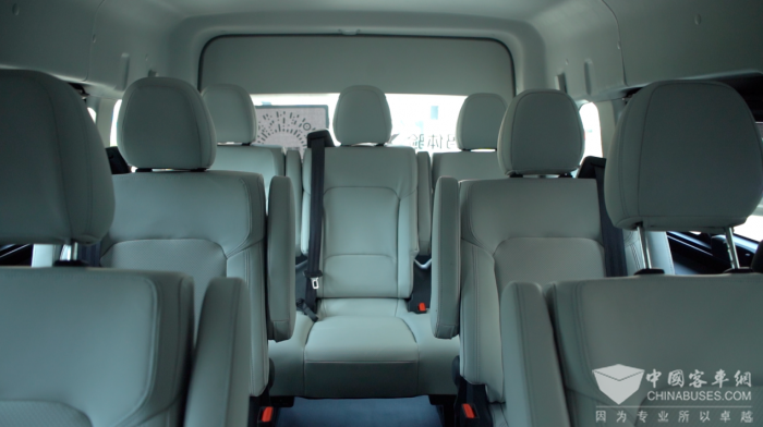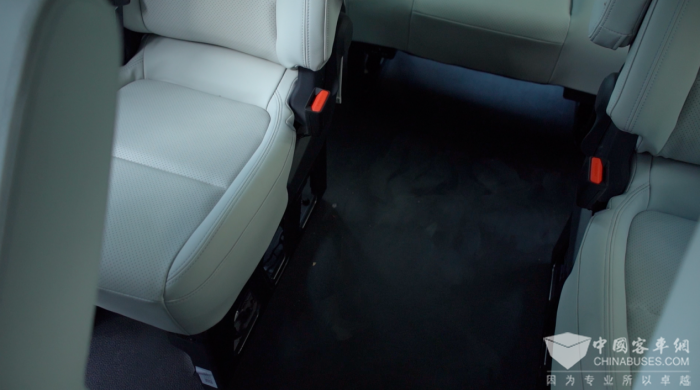 9座纯电版的空间极为宽敞,首先座椅的皮质手感非常好,海绵柔软,乘坐感受上乘,而且每个座椅都有独立扶手和靠背可调,可以有效保障舒适性。其次中央通道的横向距离也非常宽松,走进第三排、第四排毫无压力,对乘客的友好度再次提升。