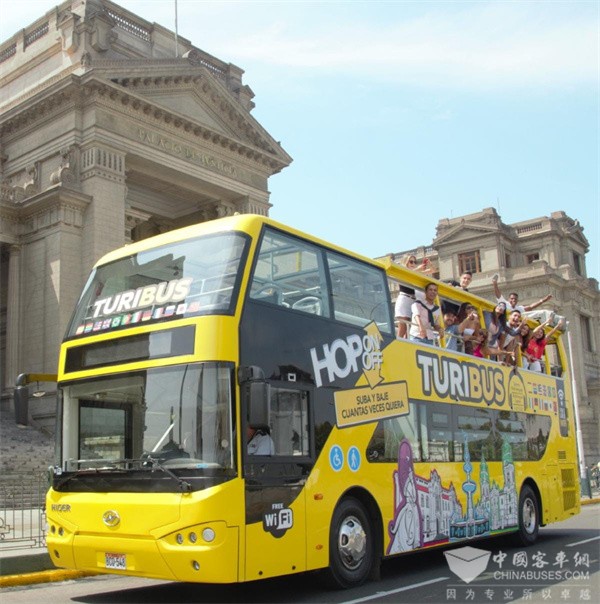 行驶在秘鲁总统府大街上的海格双层观光巴士