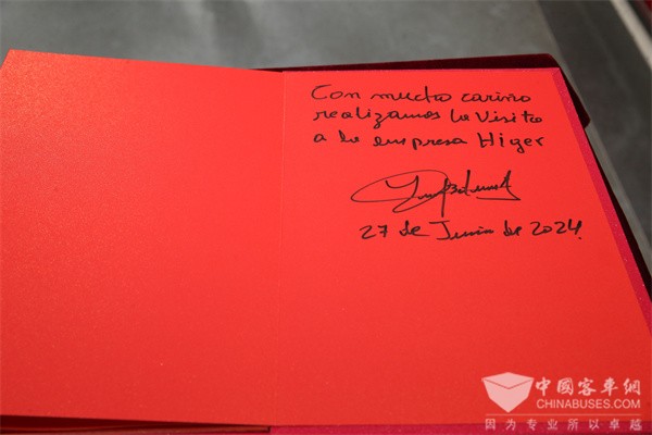 展厅参观结束后,黄书平向博鲁阿尔特赠送了海格车模,作为友谊的见证。博鲁阿尔特则亲笔写下了“满怀爱意参观苏州金龙海格”这一象征友谊的留言,向苏州金龙表达了美好的祝愿。