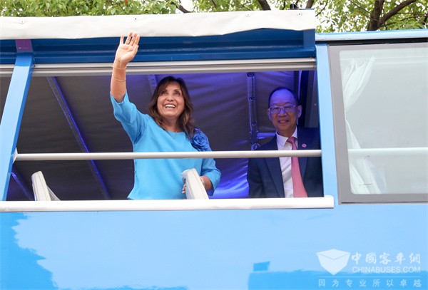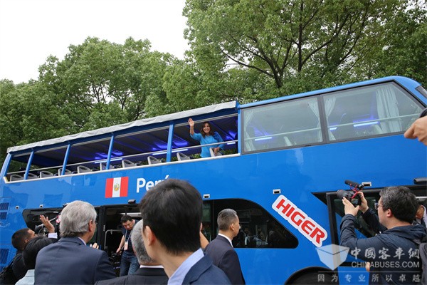 博鲁阿尔特在黄书平的陪同下,兴致勃勃地登上即将发往秘鲁的双层观光巴士体验。在双层巴士上,她举目远眺,不断向人群挥手致意。大家也纷纷举起手机拍照,记录下这一时刻。
