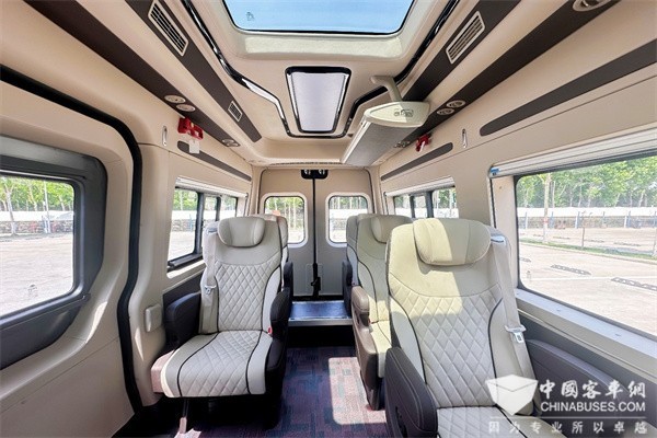 宇通天骏车内空间布局合理,V6车内高1890mm,V5车内高1770mm,乘客可在车内行走自如。同时,宇通天骏还提供了多种座位数选择(如V5的9座和V6的7/9/14/15座),满足不同场景下的运营需求。