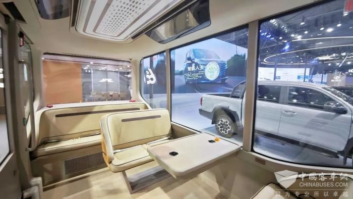 该款无人驾驶巴士外观设计全新升级,采用小立柱、大视窗的结构,优化了车内观光视线,采用4+2+4座椅布局并融合阶梯式前低后高设计,为乘客带来更加舒适的乘坐与观光体验,不仅进一步拓宽了公共交通出行的全新边界,更为用户带来科幻般的乘车交互体验。