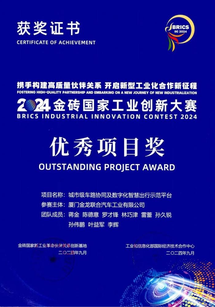 完美作业网有免费视频2024年10月16日获悉,近日,2024金砖国家工业创新大赛和2024全球数字贸易创新大赛发布了获奖名单,厦门金龙联合汽车工业有限公司(以下简称“金龙”)的《城市级车路协同及数字化智慧出行示范平台》项目分别荣获“优秀项目奖”和“创新价值企业(团队)”两项大奖。