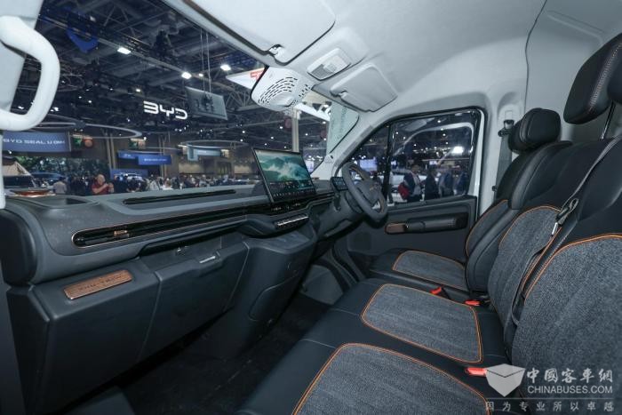 新车的内饰设计非常乘用车化,双辐式多功能方向盘设计精致,悬浮液晶仪表和15.6寸中控大屏极富科技感。座椅方面,该车前排配有三个座椅,满足多人乘坐与作业需求。