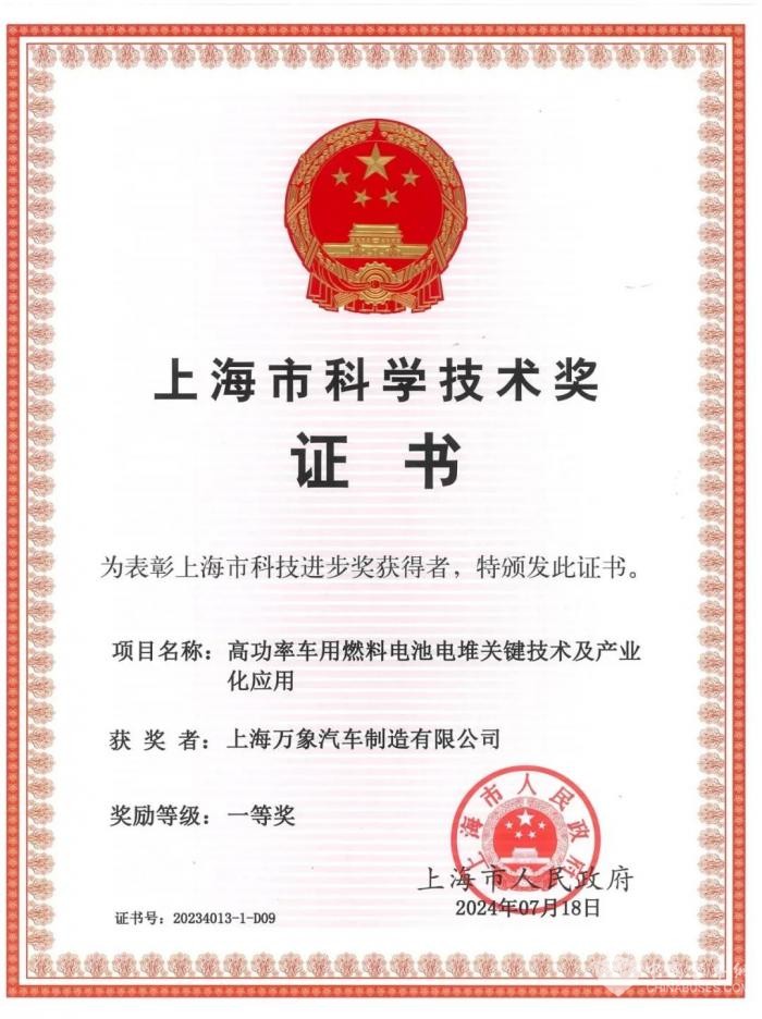 2024年10月23日,2023年度上海市科学技术奖公布,由上海万象汽车制造有限公司与上海交通大学等10家单位共同完成的《高功率车用燃料电池电堆关键技术及产品化应用》项目获2023年度上海市科技进步奖一等奖。