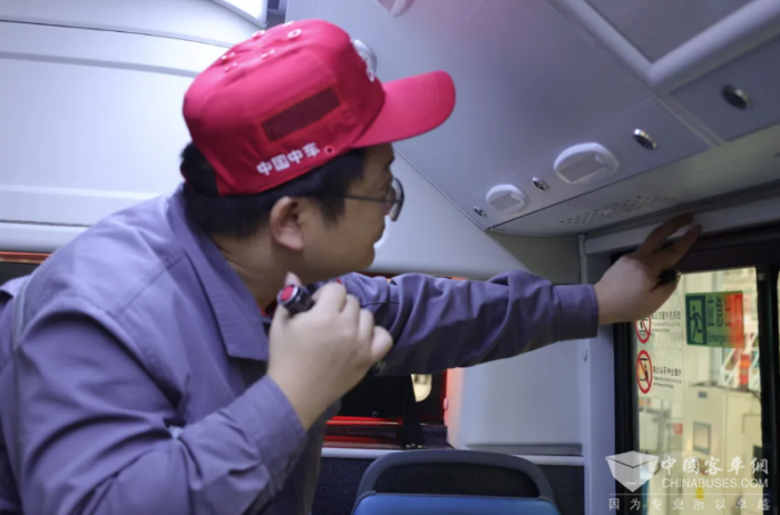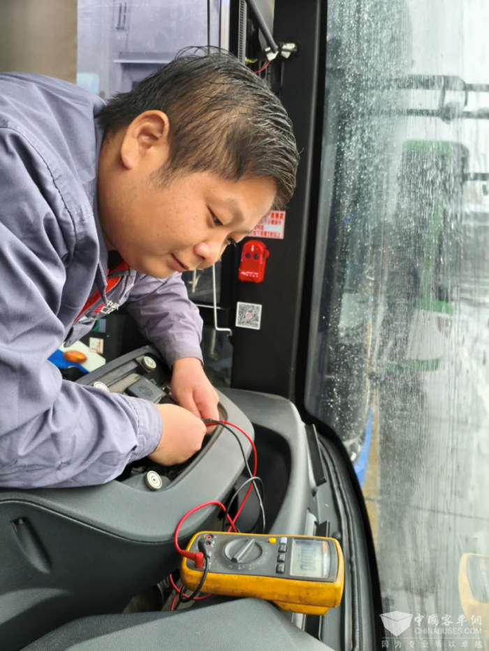 王秀时而俯身查看车底,时而起身检查万用表,他心无旁骛,为车辆平稳运行保驾护航。