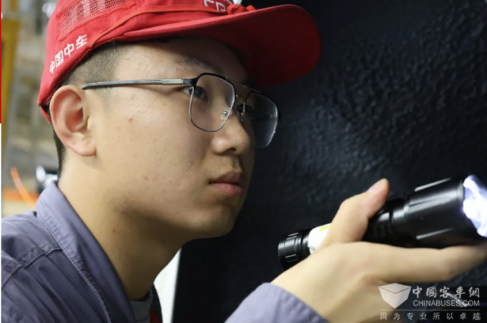在总装B线下线处,见习生刘金亮正手持电筒审视着车辆每一处细节,在他那双充满“求知”的眼睛里,期待着为企业发展贡献自己的力量。