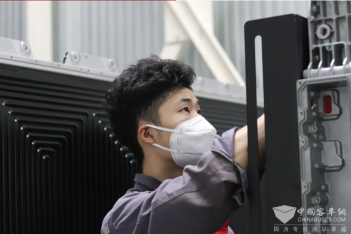 龚坤聚精会神地操作着手中的工具,一边细心打磨涂装过后的电池托盘,一边用刮刀工具轻巧地扯平塑料膜,确保每个细节都完美无瑕。