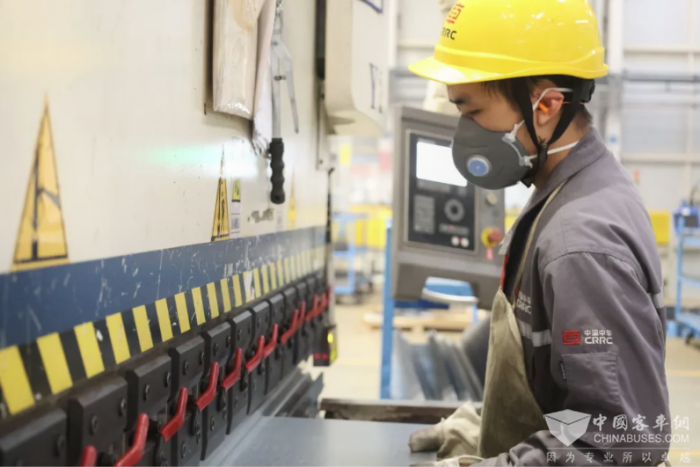 在制件车间内,来自兄弟单位(中车株机)的谭炎正娴熟的进行车身封板折弯作业,他的眼神坚如铁石,透露出坚毅果敢的力量和信念。