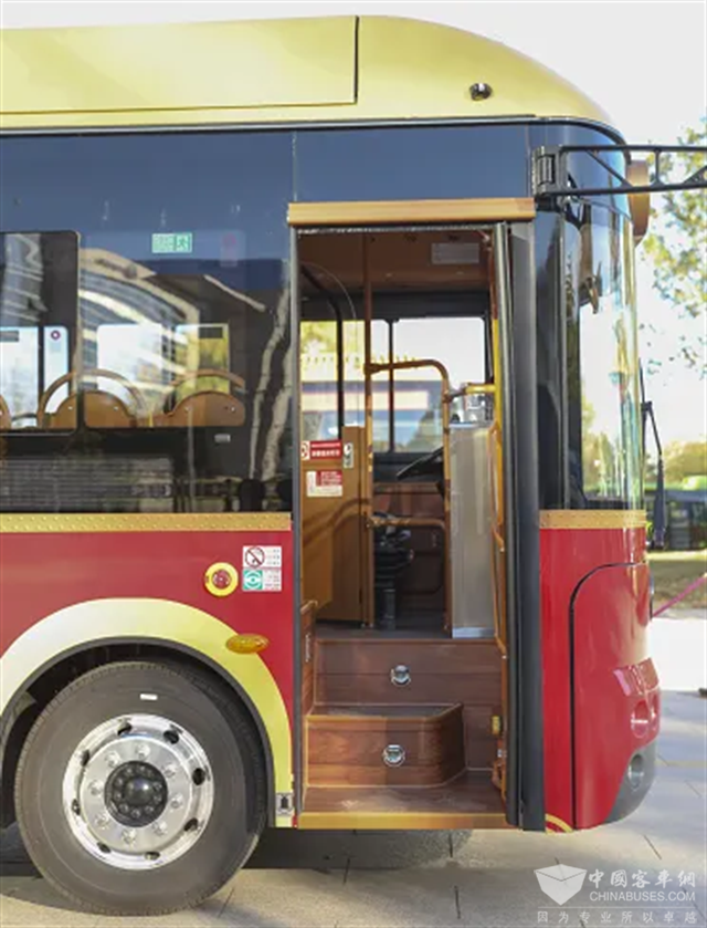 同时,整车采用前后单内摆乘客门设计,能够实现上下车无逆向客流,大幅提升乘客换乘效率;车辆内部更采用高地板纯平设计,可以给游客提供更好的观景平台;大视野的侧窗及前后挡风玻璃,大幅提升车内的透光性,给予乘客360度欣赏车外美景的自由。车内以仿古实木的棕色为主设计色调,有一种古色古香的韵味;在广告牌上可以展示当地的旅游特色、美食文化、风土人情,让乘客乘坐一辆车爱上一座城。车内采用前部侧向座椅,后部前向座椅的布局,方便游客之间进行沟通交流,同时也可以根据运营需求做整车前向座椅与侧向座椅的灵活调整。