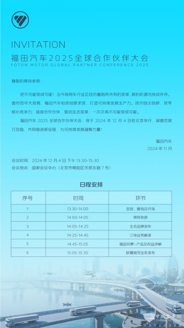 本次大会将于2024年12月4日在北京国家会议中心隆重召开,届时将有数千名权威媒体、合作伙伴、战略客户和经销商代表共同见证,福田汽车视频号、福田空间站全程直播,让我们共同期待。