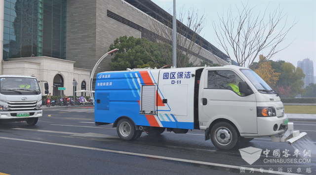 当无人驾驶小巴缓缓停靠到高标准保洁区域后,一排排苏州金龙新能源环卫车便映入眼帘。18吨纯电动高压清洗车、4.5吨纯电动清洗车、4.5吨纯电动洗扫车等全系新能源环卫车型整齐划一地停在路边。这些车型不仅外观时尚、动力强劲,应用的新能源技术还实现了零排放、低噪音的环保目标。