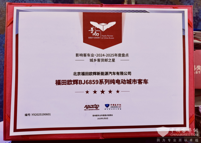 2025年1月8日,在中国完美作业网有免费视频联合中国土木工程学会城市公共交通分会主办的“第十九届影响客车业年度盘点、公交改革创新论坛暨公交客车科技交流”活动中,福田欧辉BJ6859系列纯电动城市客车,凭借安全可靠、绿色环保、轻量高效、舒适智能等多项创新优势,以及助力城乡“客货邮”融合发展,降低物流成本,助力乡村振兴等方面做出的积极贡献,实力斩获“城乡客货邮之星”奖。