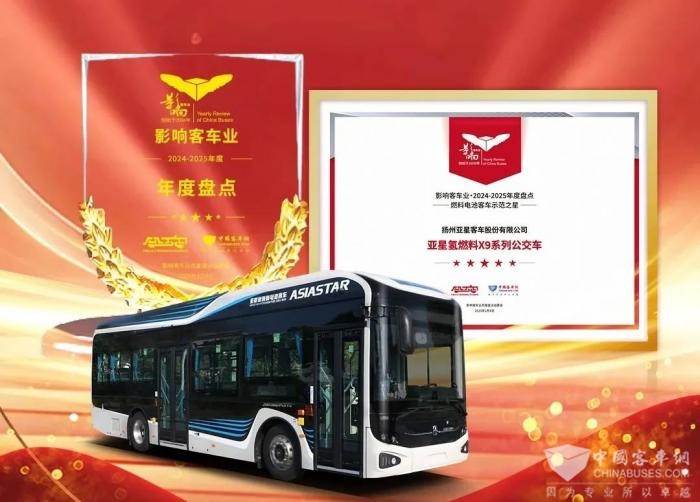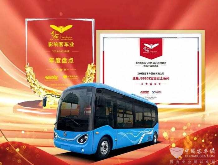 2025年1月8日,第十九届影响客车业年度盘点活动在河南郑州举行。当天,影响客车业年度盘点评选结果正式揭晓,扬州亚星客车股份有限公司旗下亚星JS6608宝宝巴士系列与亚星氢燃料X9系列公交车分别荣获2024-2025年度“微循环公交之星”与“燃料电池客车示范之星”两项大奖,向行业展示了产品力和创新力。