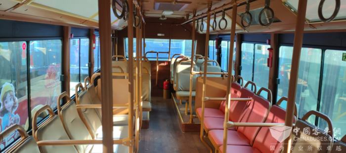 车内以复古的棕色为主设计色调,有一种古色古香的韵味;在广告牌上可以展示当地的旅游特色、美食文化、风土人情,让乘客乘坐一辆车爱上一座城。