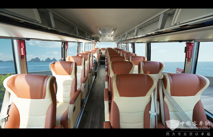 交付“火辣星城”长沙的H系旅团客车,采用1+2空间布局,配备符合人体曲线的高端商务座椅,随车冰箱、软包小吧台、中控大屏、离座报警等配置一应俱全,为乘客提供更优质舒享的出行体验。