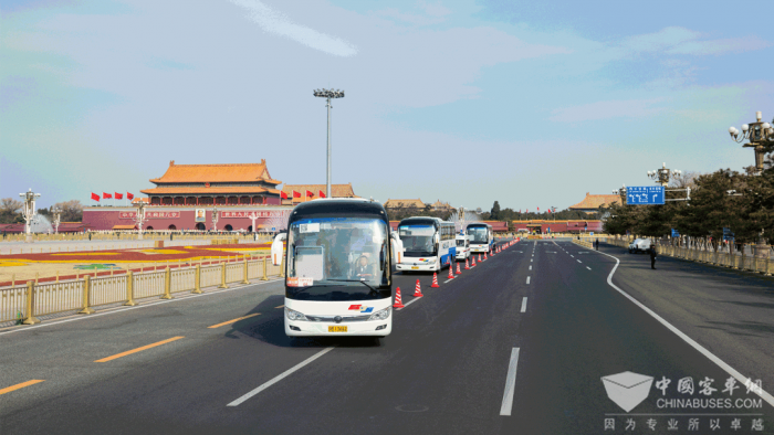 晨曦微露,春意渐浓。天安门广场上,一抹阳光洒向整齐排列的宇通T7车队,映出荣耀的光辉。