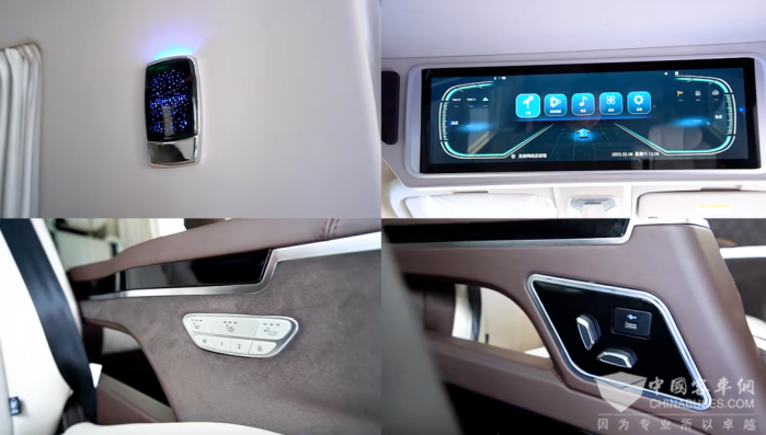再看车辆细节,同样彰显精致高档。大面积软性皮质包裹,全景星空顶等配置,直击高端商务接待场景需求,将定制化设计完美体现。正如该车定位——“我们打造的非简单交通工具,而是移动商务空间解决方案”。