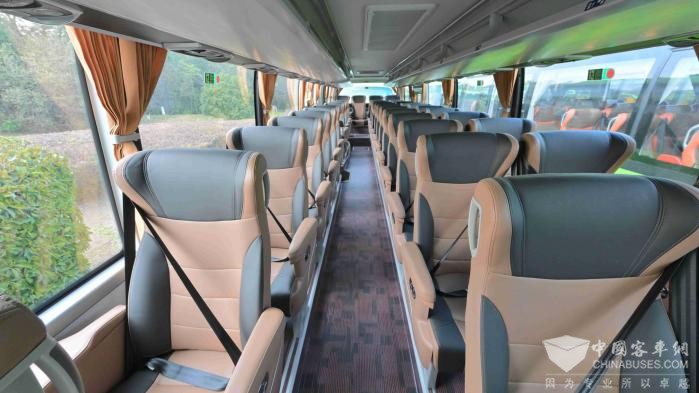 苏州金龙新V系客车的引入,为陕西宇诺的转型提供了坚实的技术底座。该车型集“新平台、新工艺、新智造”于一体,车身采用轻量化设计与高强度钢,能耗降低14.8%;车内配备智能座舱系统,支持语音交互、多屏联动及生态应用接入,为乘客打造“高铁级”舒适体验。尤为值得一提的是,“2+1”座椅布局搭配加宽过道、可调节尾排设计,使乘坐空间较传统车型提升30%,辅以均温空调、USB充电接口等细节配置,全方位满足游客对“精致旅途”的期待。