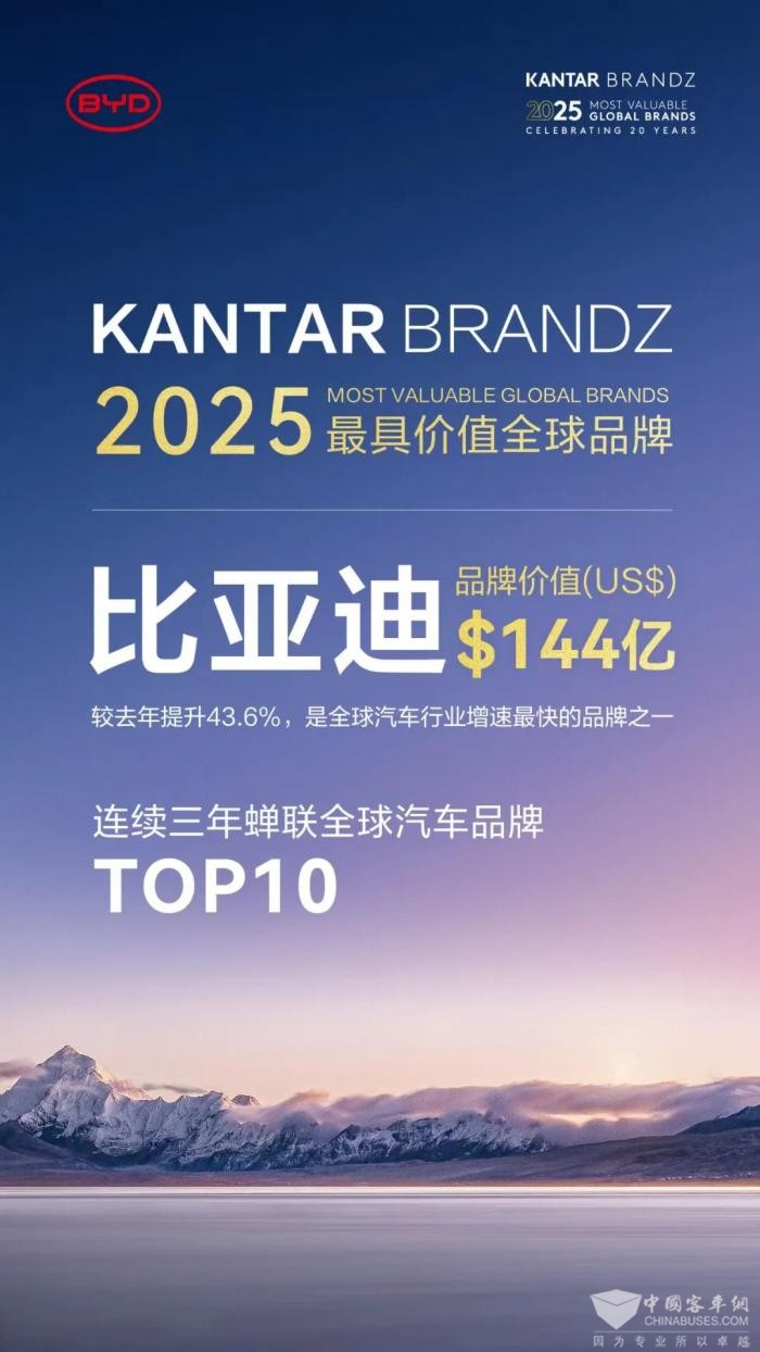 完美作业网有免费视频获悉,2025年5月15日,国际权威品牌评估机构凯度(Kantar)发布《2025凯度Brandz最具价值全球品牌》榜单,比亚迪连续三年蝉联全球汽车品牌前十,且以144亿美元的品牌价值强势冲入榜单第六名,品牌价值同比飙升43.6%,成为全球汽车行业增速最快的品牌之一!这一里程碑不仅刷新了中国汽车品牌的历史高度,更彰显了比亚迪在全球新能源赛道上的领跑实力。