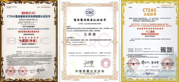 从2018年行业首个荣获中国质量认证中心(CQC)“五星级”售后服务认证,到2019年获CTEAS售后服务体系“七星级(卓越)”认证、2021年获中国汽车售后服务客户满意度调查(卡思调查)“客车品牌第一名”,再到2022年5月通过“CTEAS十二星级(服务能力持续有效验证)”认证……安凯正以持续进化的服务力,书写着中国客车行业服务升级的新范本。