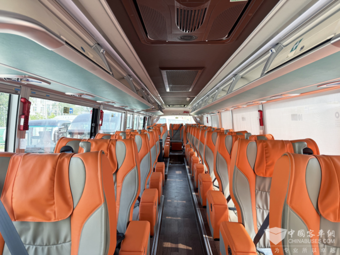 BJ6122外观采用现代美学设计,车身线条流畅,尽显动感与优雅。内饰方面,车内采用全新开发的豪华内饰,全包式驾驶舱配备仿生学设计的内凹式行李架和穹顶式中顶设计,既美观又实用。乘客区采用1+1头等舱豪华布局,配备符合人体工程学的豪华大商务座椅,采用双密度海绵填充,为乘客提供极致舒适的出行体验。