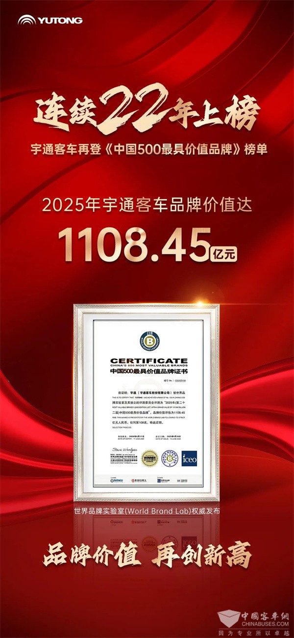 2025年6月18日,在第22届世界品牌大会暨中国500最具价值品牌发布会上,世界品牌实验室正式发布《中国500最具价值品牌》分析报告。宇通客车连续第22年入选榜单,品牌价值首次突破千亿大关,达到1108.45亿元,这一里程碑式的突破,不仅是宇通长期坚持科技创新与品牌建设的集中成果,更标志着中国客车在全球新能源革命中的技术实力与市场地位,是“中国智造”价值跃升的生动写照。