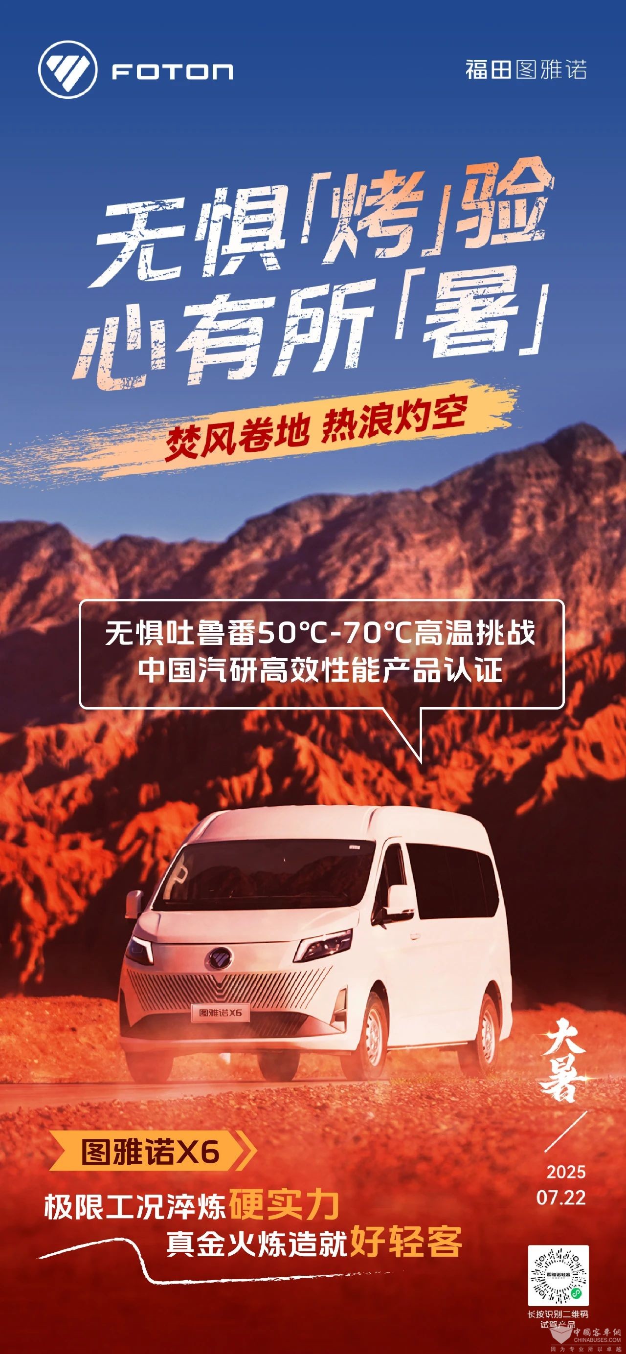 2025年7月22日完美作业网有免费视频讯——福田图雅诺通过50℃-70℃中国汽研高效性能产品认证。
