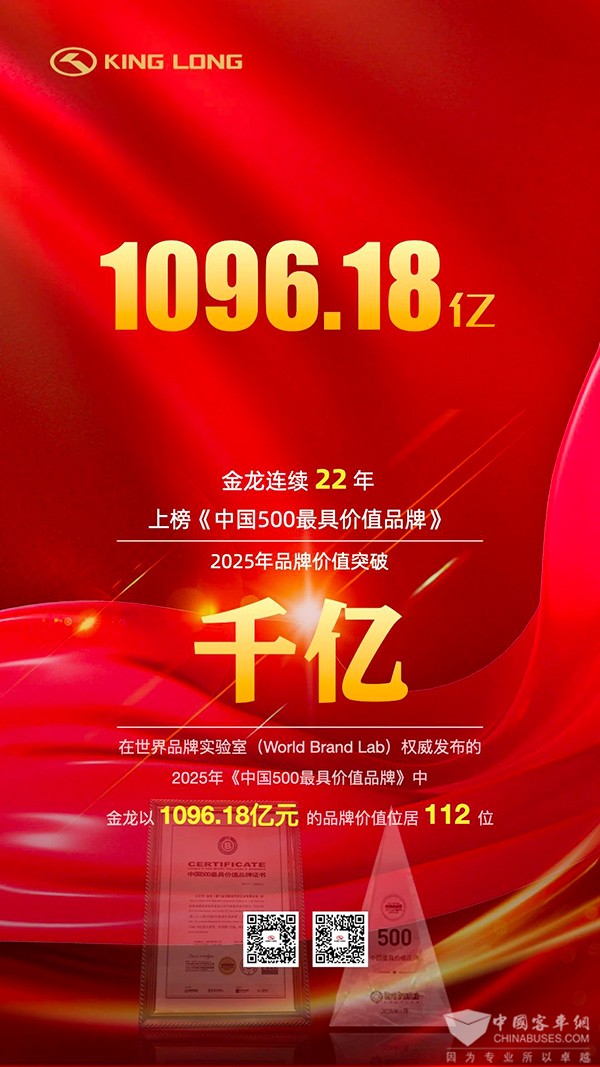 在各大权威评选中,金龙屡获殊荣:“客车行业品牌成就奖”“客车技术创新应用成果奖”“高端商务客车之星”“卓越创新传播标杆奖”……荣誉等身。2025年6月,金龙品牌价值更是首次突破千亿大关,以1096.18亿元的卓越成绩再创新高,连续22年入选榜单。这不断攀升的品牌价值,是市场对金龙产品力、创新力、品牌力的高度认可,更是中国民族品牌崛起、向制造强国迈进的有力印证。