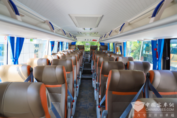 本次交付的这批纯电旅游客车,外观造型时尚动感,车身线条流畅,涂装融入椰树等热带风情元素,彰显海南热带海岛活力。车内空间宽敞,采用2+2座椅布局,配备人体工学双密度海绵座椅,有效缓解长途疲劳,让旅客于舒适中尽览海南山海和人文之美。