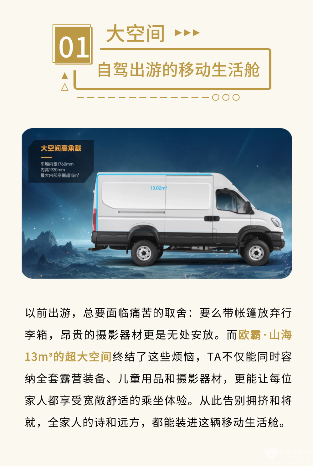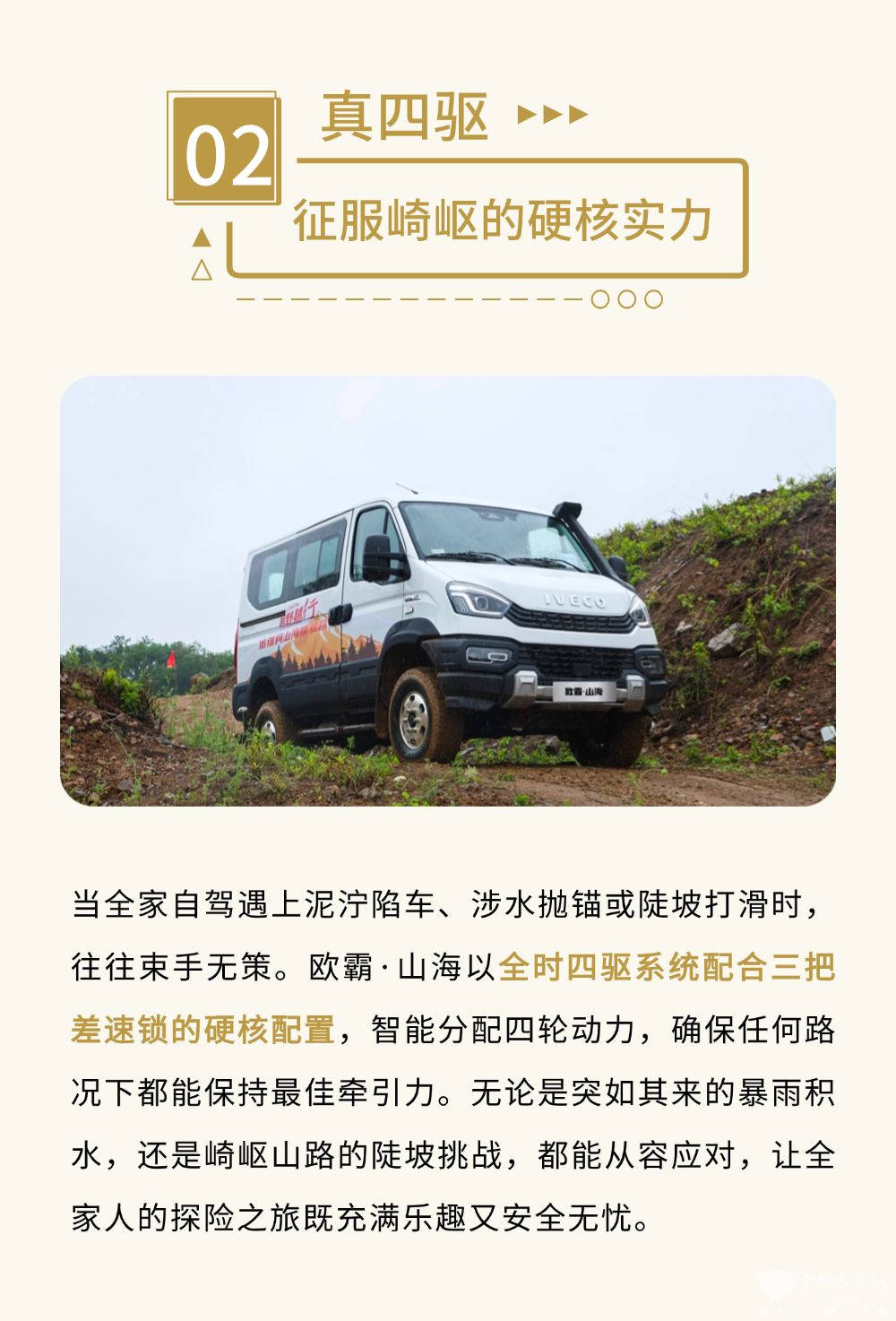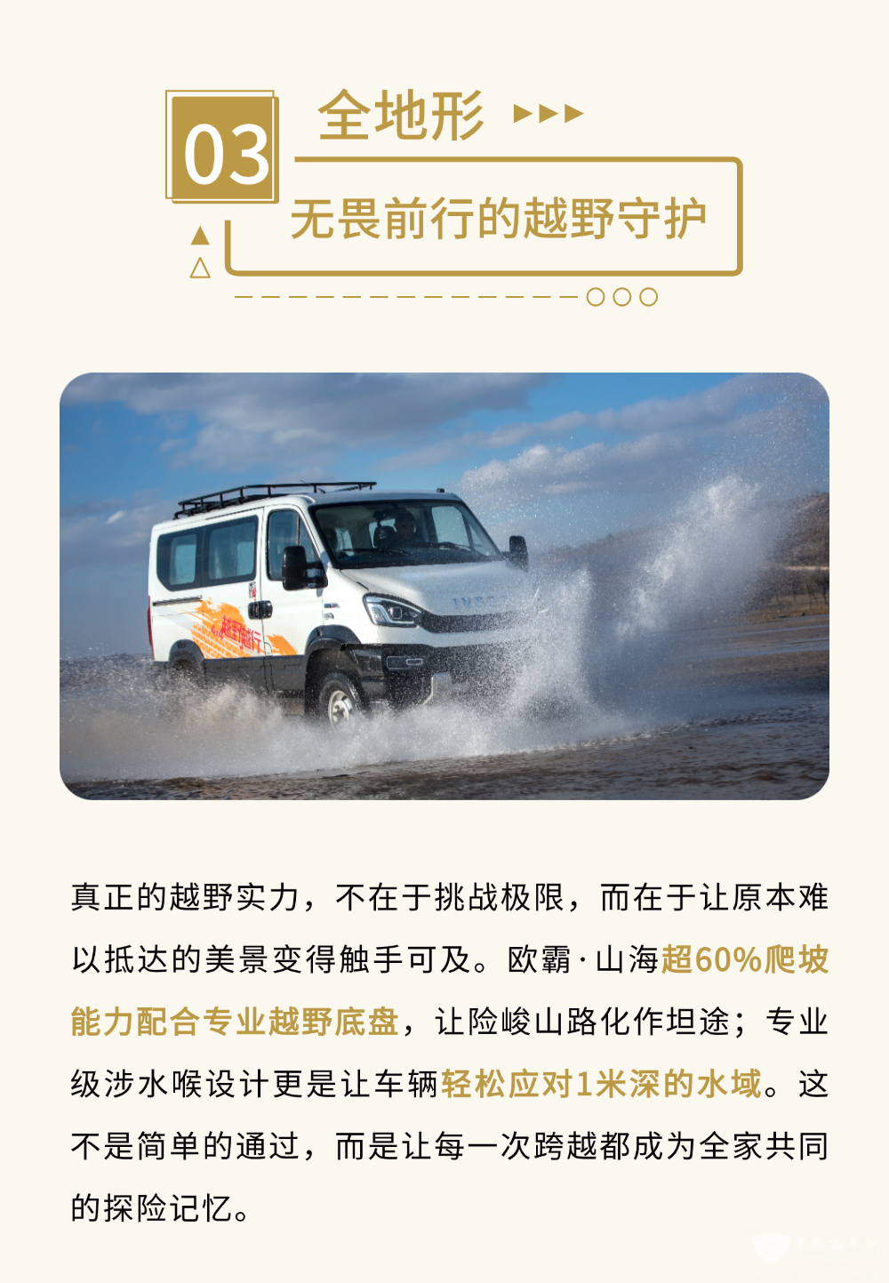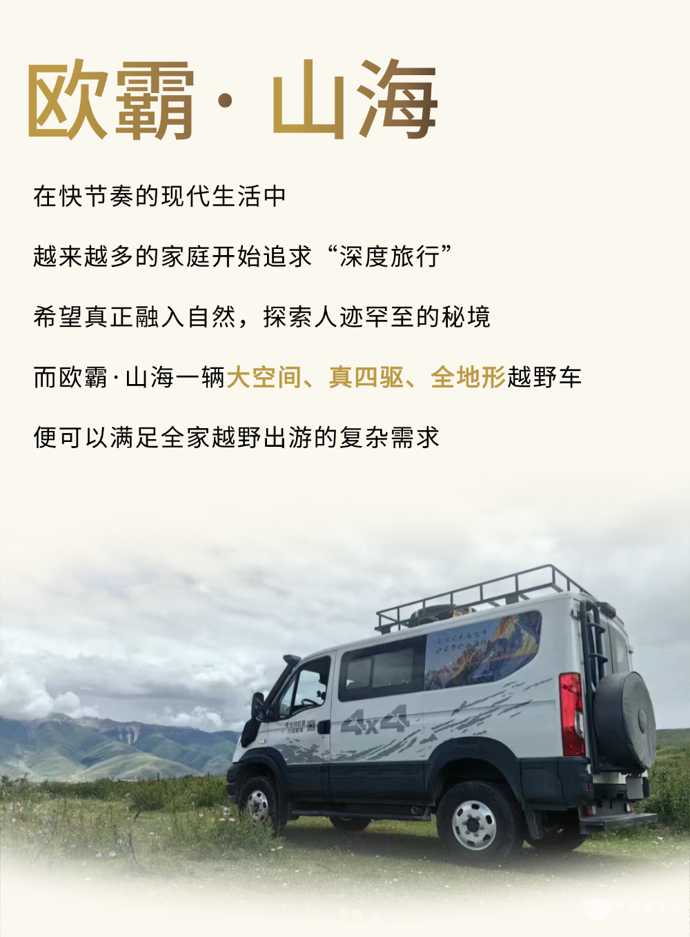 随着越来越多家庭追求深度旅行,欧霸·山海满足大空间、真四驱、全地形的越野车条件,拥有13立方米超大空间,可容纳大量装备,全时四驱系统配合三把差速锁可保持最佳牵引力,超60%爬坡能力搭配专业越野地盘,轻松应对涉水地形。