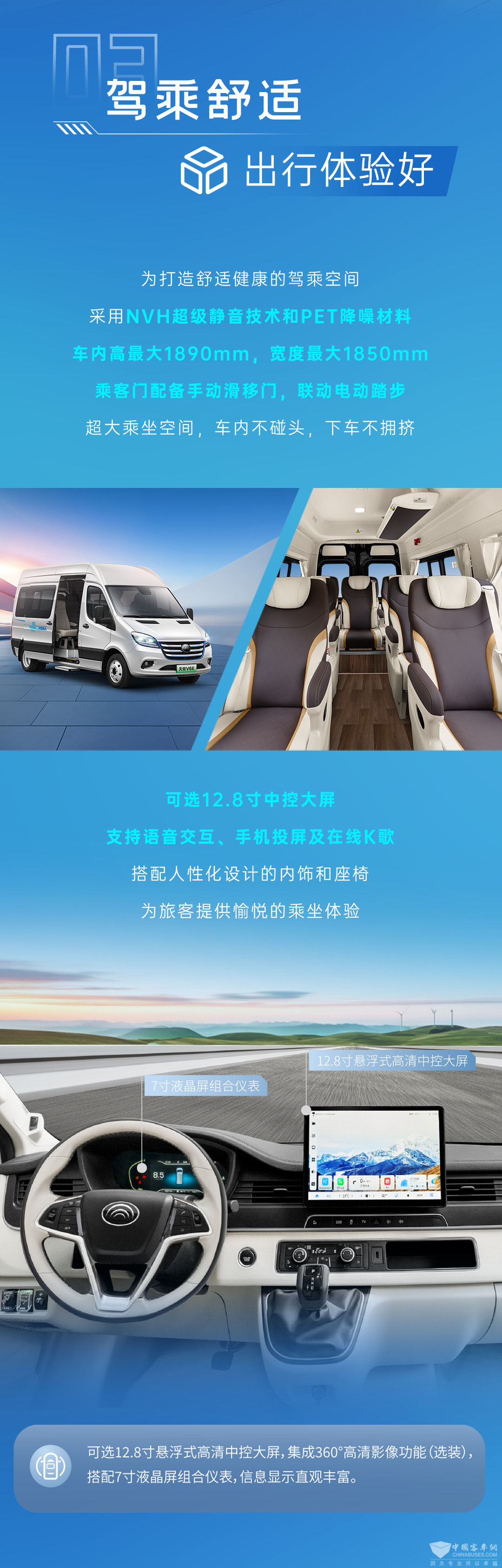 承袭客车品牌基因,宇通天骏V6E具有可靠耐用的优点,电池系统使用寿命长达10年100万公里,车身刚占比超55%,具有超高强度,采用NVH超级静音技术和降噪材料,提升出行体验。SiC控制器帮助提升效率,最高可达99.7%。