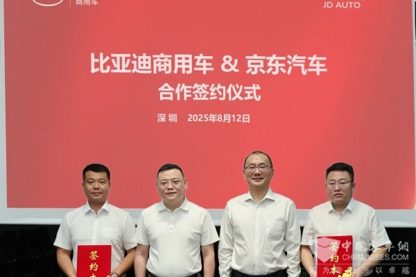 2025年8月12日,比亚迪商用车与京东汽车在深圳坪山总部正式签署战略合作协议。比亚迪商用车事业部总经理田春龙、京东集团高级副总裁王培暖共同见证。