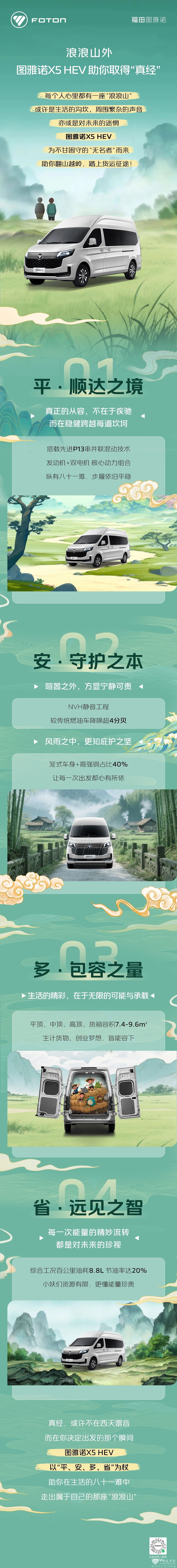图雅诺X5搭载先进P13串并联混动技术,保证旅途平稳,NVH静音技术维护车内静音,405高强钢占比车身守护乘客安全,货箱容积达7.4——9.6㎡,百公里油耗8.8L,节油率可达20%。