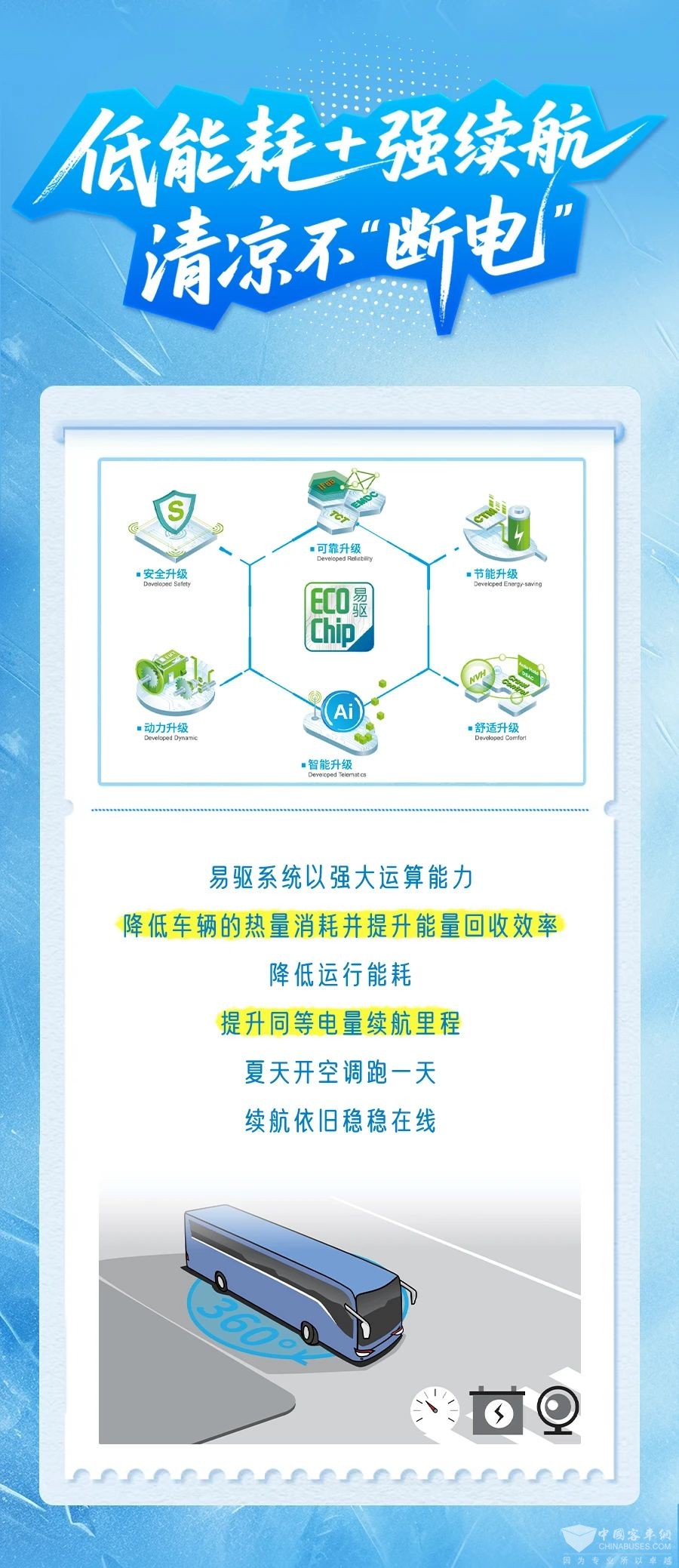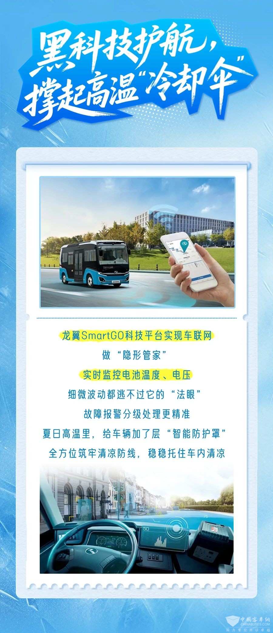 金龙客车带您体验夏日凉爽,一体式出风口布局与驱动技术协同,瞬间启动空调,龙翼SmartGo科技平台实现车联网,实时监控电池温度和电压,易驱系统能降低车辆热量消耗,且储能电池泡水风险大大降低。