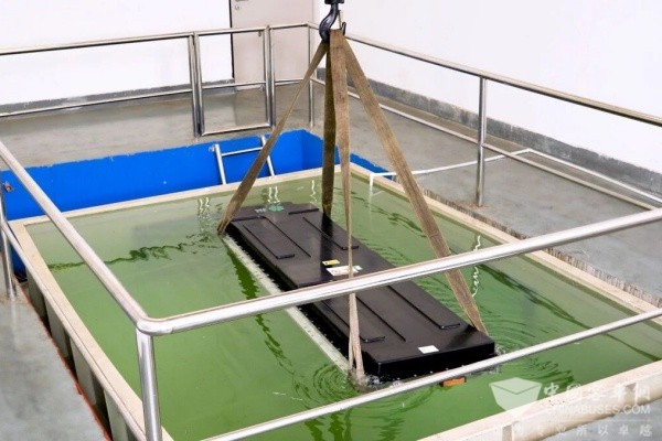 在完成126小时超国标振动测试后,福田爱易科电池不经休整便直接进入1.5米深的3.5%高浓度盐水中持续浸泡72小时(新国标仅要求2小时浸没即可)。这样连贯严苛的测试,相当于模拟车辆在长期颠簸后突然遭遇极端涉水险情,以此考验电池在经历结构疲劳损耗后的密封可靠性,其难度远超单一环境测试,福田爱易科电池依靠分子级密封体系实现优异防护。电池采用大平法兰面结构搭配高性能氟硅橡胶密封圈,凭借泡棉结构的高回弹性紧密填补缝隙,配合真空负压检测技术,能在0.02MPa气压下实现泄漏率≤5cc/h(仅为IP68标准的十分之一);同时,箱体主体通过精密焊接工艺保障结构完整性,液冷系统更可承受4bar测试压力(相当于40米深海水压)。测试后,电池不仅无泄漏、未起火、未爆炸,绝缘电阻≥500Ω/V,还能直接满电装车平稳运行——这一结果直观印证了其在“振动疲劳+深度涉水”连续极端工况下的超预期可靠性,让用户即便在长期运营中突遇暴雨积水、沿海高盐雾环境,电池仍能保持稳定安全,彻底消除极端场景下的运营隐患,为车辆全生命周期的安全高效运营筑牢防线。